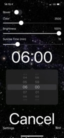Drag the Sunrise Time slider to set the sunrise duration. You can vary this between 1 and 60 minutes. If you set it to 15 mins, the light will turn on 15 minutes before your wakeup time, and be maximally bright at the wakeup time. The brightness increases using a sigmoidal function as described by Avery. The colour temperature of the light starts at the minimum colour temperature and increases to 3700K at the alarm time. After this, the colour temperature continues to increase gradually until the end of your wakeup sound.